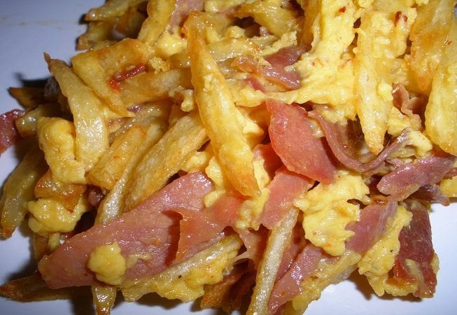 Lejos de los tiros y de toda pérdida que siempre implica un episodio de guerra, don Arturo Gramajo sí que era todo un ganador. Típico dandy ricachón; clásico ejemplo de que billetera no mata galán, sólo porque este playboy de los años ’30 descocía las noches porteñas con unos cuantos billetes en su haber. ¡Y ojo que tenía lustre internacional! Ferviente habitué de la noctámbula París, hacía del día la noche y de la noche el día. Hasta que uno de sus diurnos sueños en el Hotel Ritz se vio interrumpido por cierto apetito (a fin de cuentas, su sacrificado derrotero de clubes nocturnos lo obligaba a mantenerse bien alimentado). Sin embargo, las cocinas del gran hotel se encontraban cerradas. ¿Desde cuándo alguien pedía un almuerzo en plena tarde? Apenas un poco de jamón, pan y algunos huevos habían sobrevivido a la hora del almuerzo. ¡Cuánta vulgaridad para un paladar como el suyo! Así fue como, tan indignado como hambriento, Arturito tomó el toro por las astas…o la sartén por el mango. Pero no vaya a creer que en sentido literal. Eso era asunto de los cocineros, a quienes no les quedó más que obedecer las órdenes que impartiera Gramajo. Porque billetera no mata hambre, pero ayuda a saciarlo, o a tomarse la atribución de que otros lo hagan. ¿El resultado? Un lindo revuelto a base de jamón huevo y crujientes papas fritas. Y mire si habrá sido del agrado de Arturo que, ya en Buenos Aires, desparramó la receta entre su círculo más fifí. Aquel que lo adoptó con gran fanatismo.