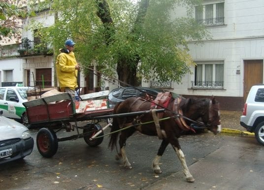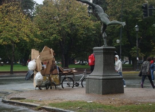 Síntoma visible de la situación social de grandes ciudades como Buenos Aires, los cartoneros constituyen la evidencia más palpable de la crisis social y económica Argentina de las últimas décadas. Hasta hace poco excluidos de los regímenes laborales vigentes, muchos de ellos han alcanzado un régimen que los ubica en un lugar de mayor visibilidad social e inclusión. En su mayoría procedentes del conurbano bonaerense, y con el fin de recolectar papel, plástico, vidrio y cartón, familias enteras recorren la ciudad con carros tirados por ellos mismos, para intercambiar por peso, más tarde, ese material que les posibilita sostenerse económicamente.