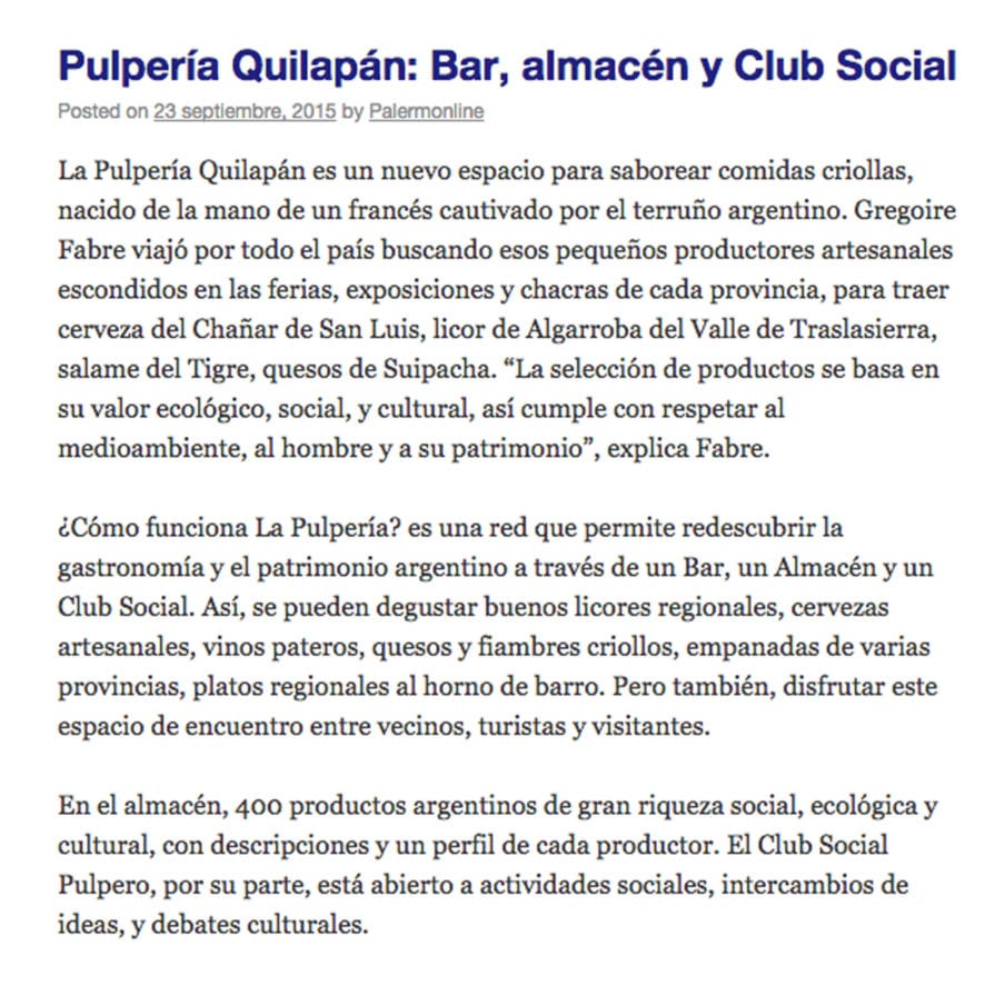 La Pulpería Quilapán es un nuevo espacio para saborear comidas criollas, nacido de la mano de un francés cautivado por