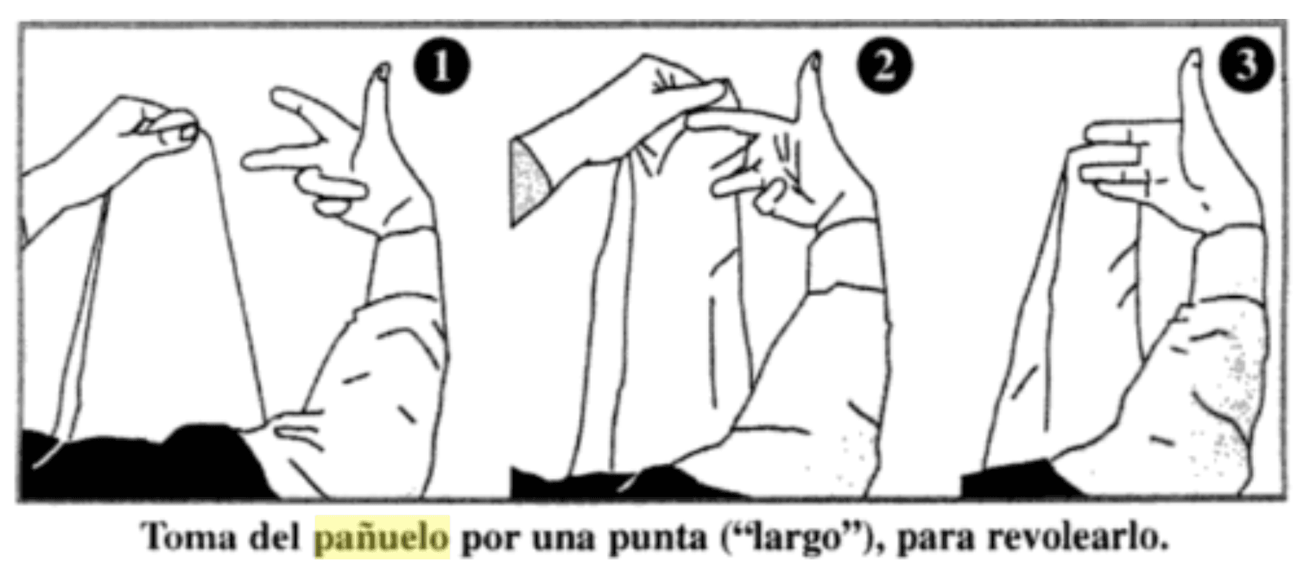 Entrelazado entre los dedos con una pequeña dobladura, el pañuelo cuando se eleva al aire generalmente en el arresto. Este se dispone a dibujar una forma de ocho, sostenido por los dedos índice y medio con fuerte movimiento desde la muñeca.