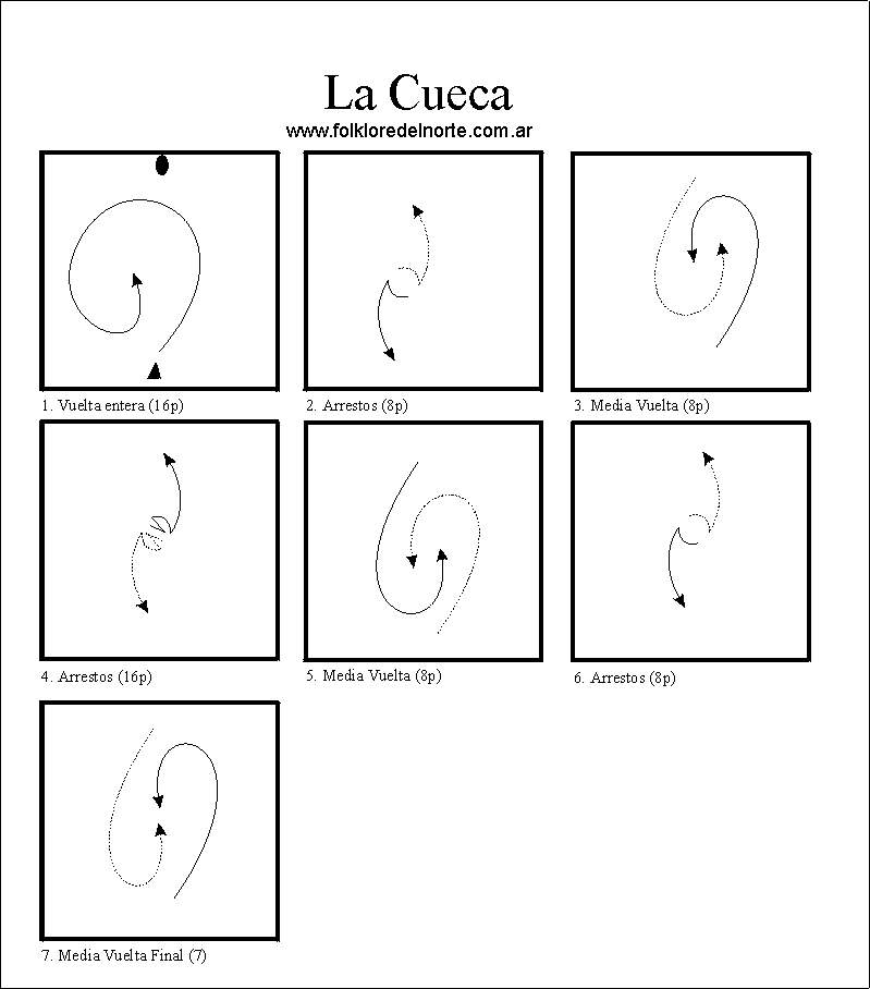 Se danza en círculos y semicírculos, que conllevan a encuentros y alejamientos entre bailarines. Desarrollos espaciales que llamaremos vueltas y medias vueltas, giros y contra giros; y se transitan hacia el centro y hacia las bases (la base es el lugar que ocupa cada bailarín al comienzo de la danza). Se utilizan dos clases de paso: “caminados” a tiempo, por un lado, y por otro, “pasos saltados” que se desarrollan cómo pequeños saltos sobre un tresillo, (similar a un vals saltado, 1, 2, 3). Se danza con el elemento pañuelo, el cual acompaña la danza y la expresividad de los bailarines.