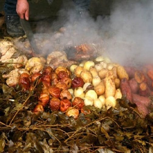 La posibilidad de generar calor “subterráneo” como medio de cocción fue el “descubrimiento” que dio origen al curanto, plato que se convertiría en una tradición gastronómica del sur (especialmente en Chile) ¿Cómo generar este “efecto horno” bajo tierra? En un pozo de aproximadamente medio metro de profundidad se colocan piedras y brasas. Cuando las piedras ya están al “rojo vivo” se retiran los tizones y se colocan hojas de Nalca o Maqui. Una vez listo este “colchón” verde, los alimentos se distribuyen en el pozo y el proceso vuelve a comenzar de atrás para adelante: más hojas, piedras y tierra. ¿Suena cansador? Paciencia, el llamado “curanto de hoyo” lleva bastante tiempo de preparación, razón por la que -sumada la gran cantidad de alimentos que se “entierran”- más vale que los comensales estén hambrientos… ¡y que traigan compañía! Se trata de un plato ideal para multitudes.