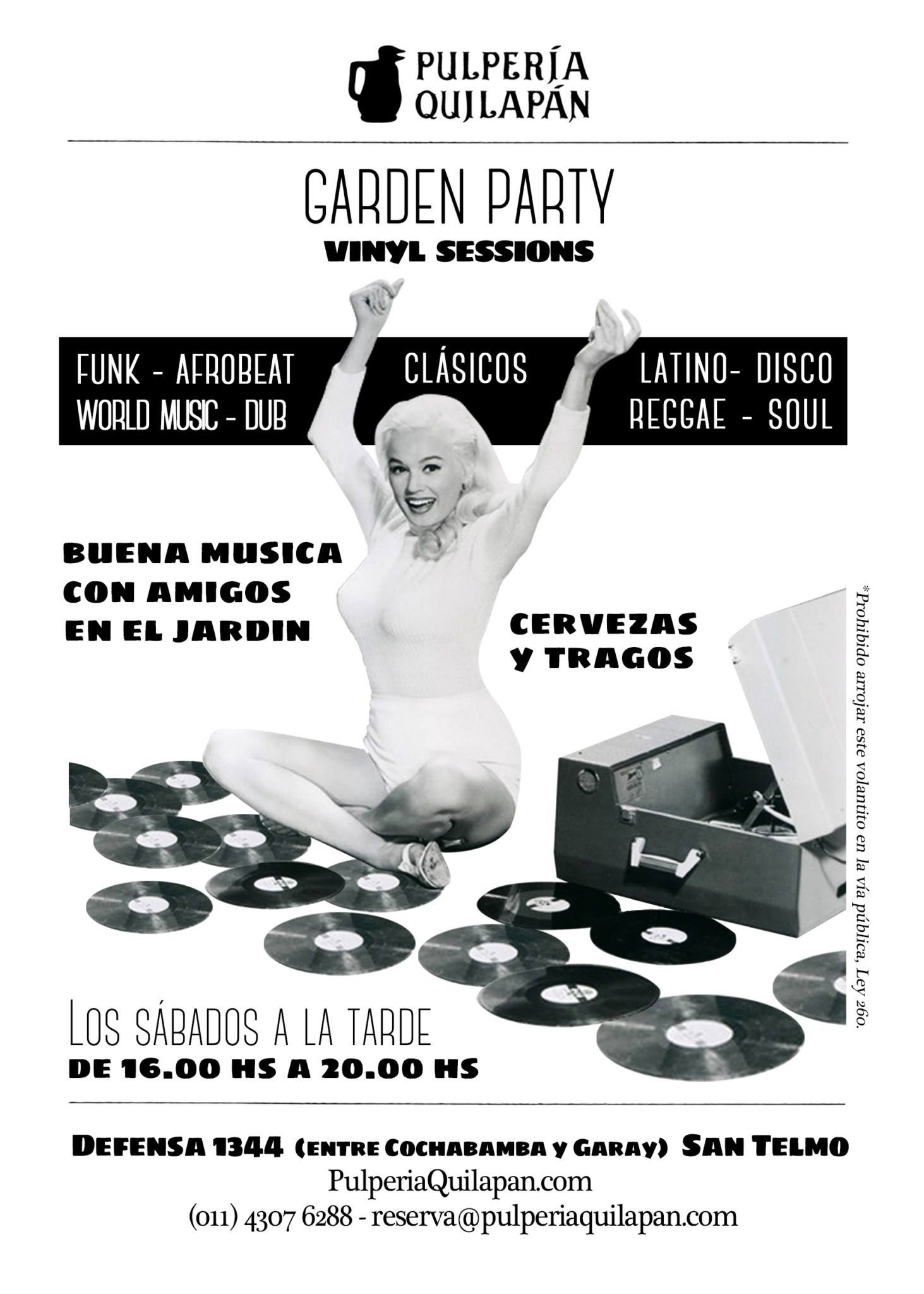 Les presentamos el ciclo Garden Party Vinyl session. Los residentes llevan lo mejor de sus colecciones de vinilos y convocando amigos DJs y No/DJs a que traigan los suyos. Músicos, melómanos, periodistas y coleccionistas hacen sonar lo más selecto de sus discografías privadas.