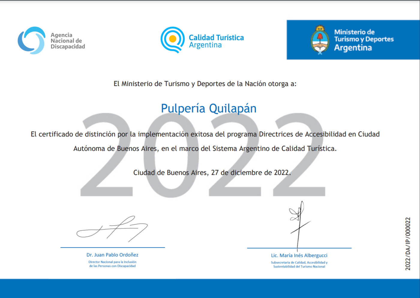 El Ministerio de Turismo y Deportes de la Nación otorgo a Pulpería Quilapán el certificado de distinción por la implementación exitosa del programa Directrices de Accesibilidad en Ciudad Autónoma de Buenos Aires, en el marco del Sistema Argentino de Calidad Turística.