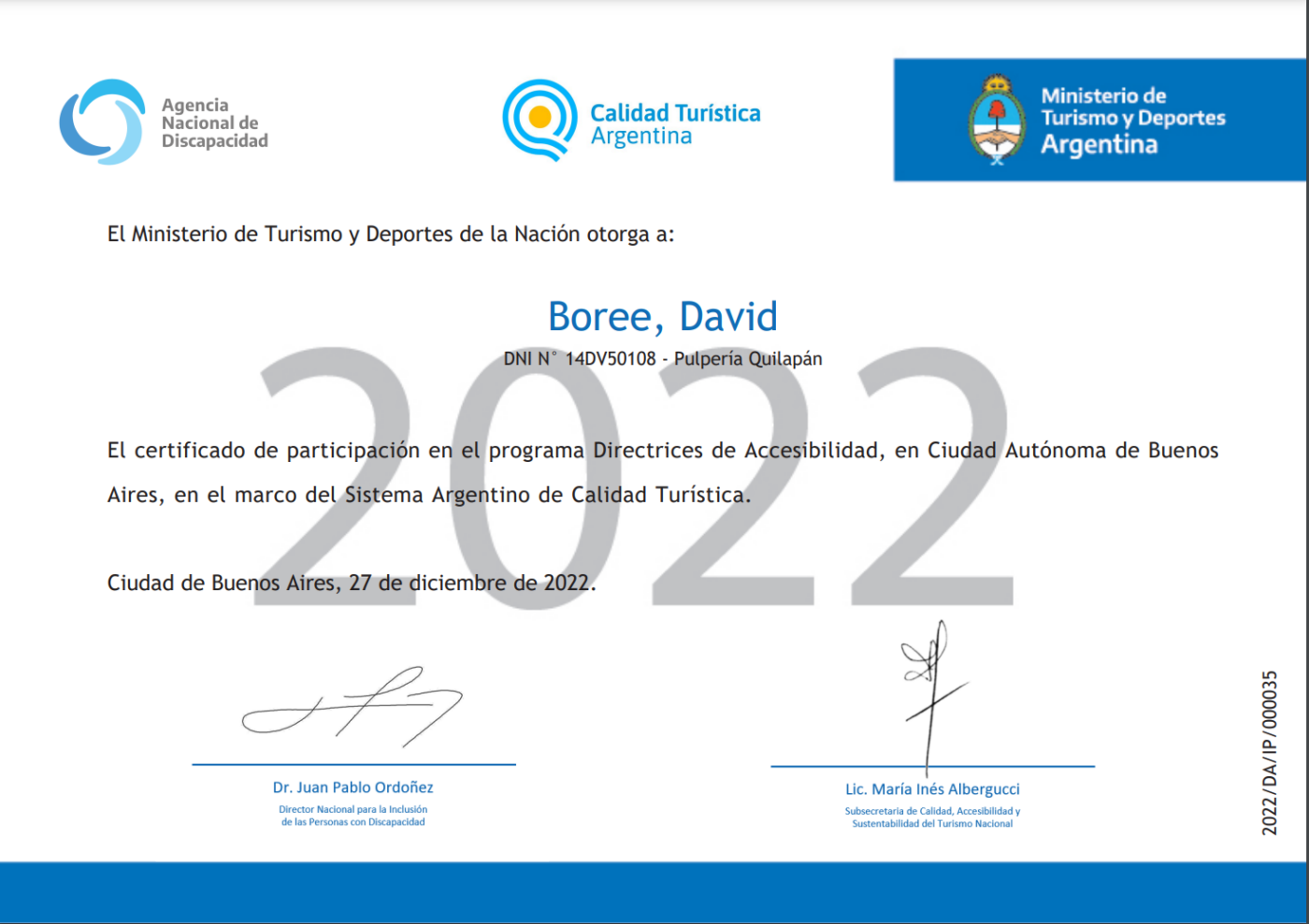 Todo nuestro equipo está capacitado con la formación de Accesibilidad Turística y Turismo Responsable y Género del Ministerio de Turismo y Deportes Argentina.
