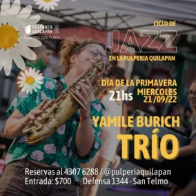 - El miércoles, empezandito la semana, nos acompaña Yamile Burich Trío con Ramiro Franceschin en la guitarra y Leonel Cejas en el contrabajo. Esta noche el pulpero ofrece aperitivos clásicos argentinos para mesa de chicas desde las 20:00 hs.