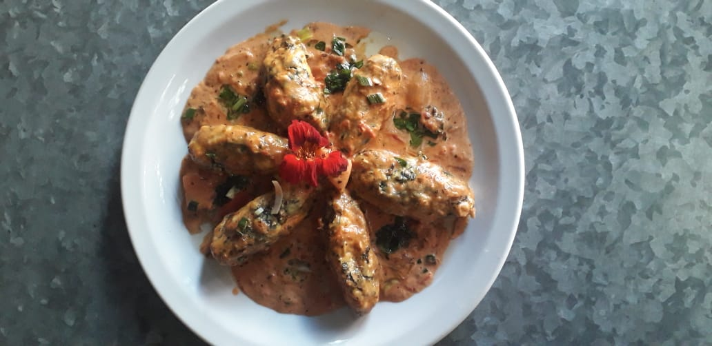Malfatti de espinaca, ricota y zanahoria con salsa rosa