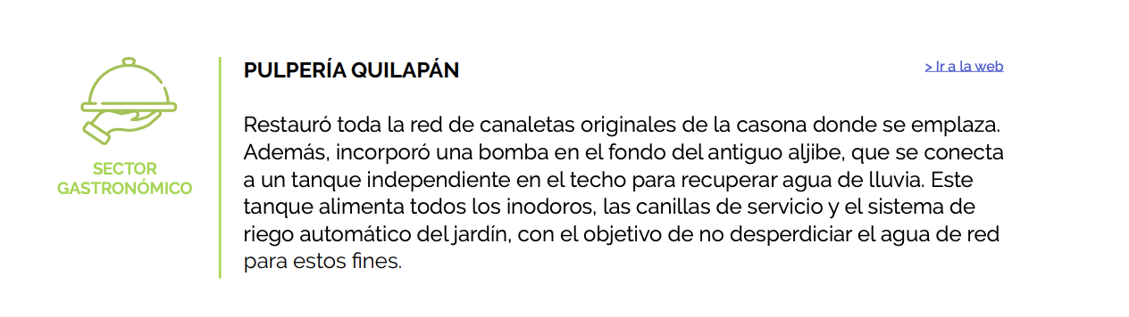 It has a green roof that allows a good thermal insulation and an abundant production of mint to offer in homemade lemonades; at the same time it contributes to offset the urban heat island phenomenon. In order to save drink water, all of the rain water is gathered from the roofs of the Pulpería Quilapán, and then used for the toilets, the watering of the garden, and some of the cleaning.