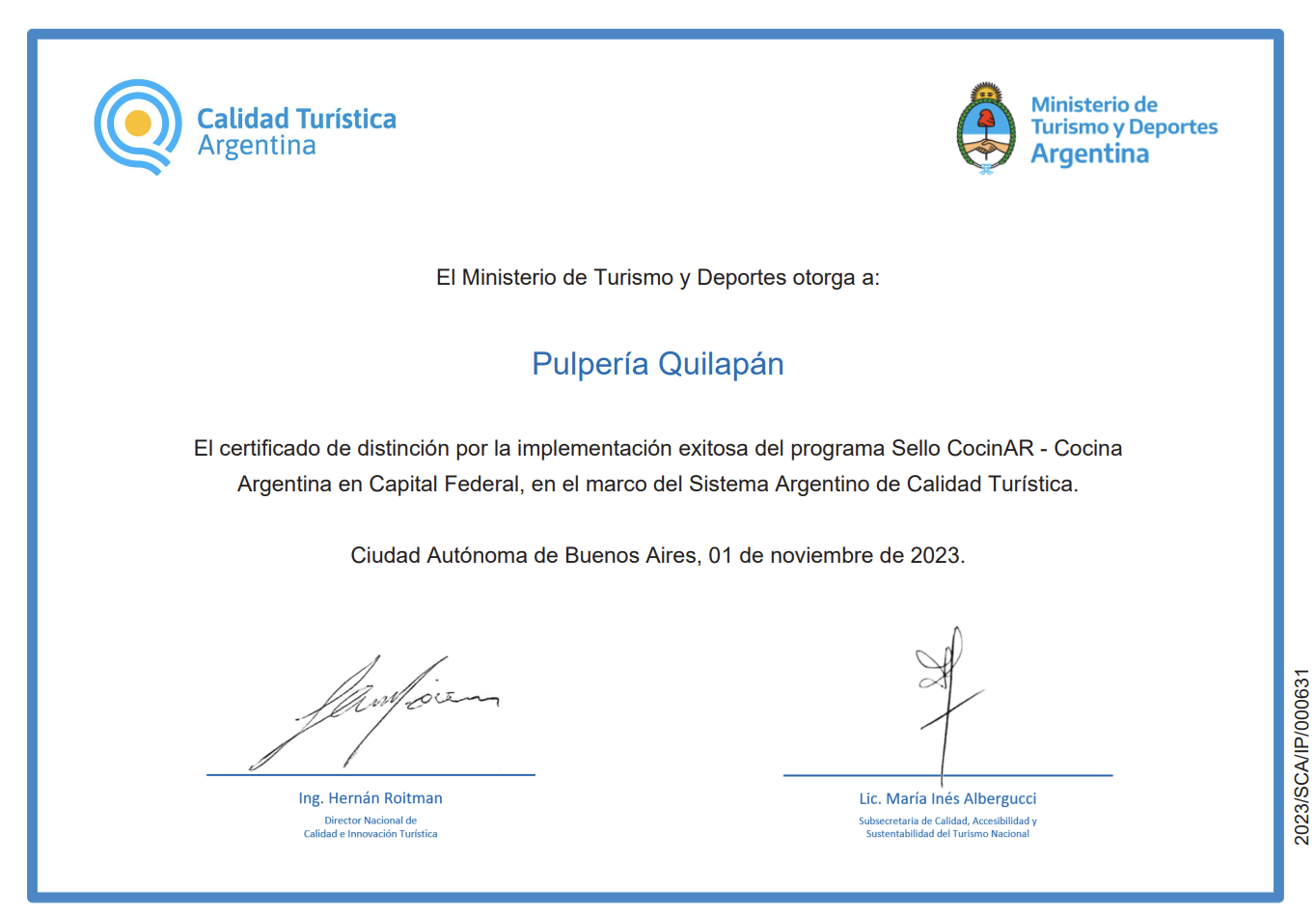 Por medio de la presente, tengo el agrado de comunicarle que, tras la jornada de evaluación de la implementación de las Directrices de Gestión Ambiental perteneciente al Sistema Argentino de Calidad Turística, realizada en el mes de noviembre del corriente, la organización “Pulpería Quilapán” presenta las evidencias suficientes para obtener el distintivo asociado al programa.