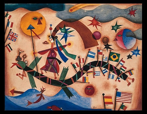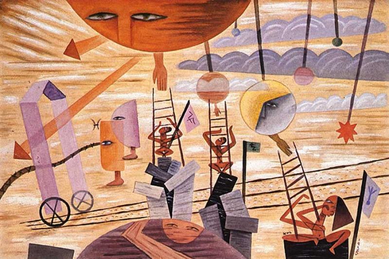 No fueron muchas las exposiciones que tuvieron lugar en Argentina de Xul Solar pero la actividad intelectual de este artista no tuvo descanso. Se vinculó con vanguardistas tales como Oliverio Girondo o Macedonio Fernández y estrechó un importante vínculo con Jorge Luis Borges que se convirtió en su admirador. En la pintura de Xul Solar aparecen elementos vinculados con la religión cristiana, judía, islámica y está plena de símbolos; son recurrentes las estrellas de David, los ángeles, las serpientes y los astros; pueden aparecer banderas, cúpulas, dragones u ojos e infinitas cosas más porque una mirada que tenía puesto su umbral en la totalidad, tanto tenía para transmitir como para impulsar a interpretar.